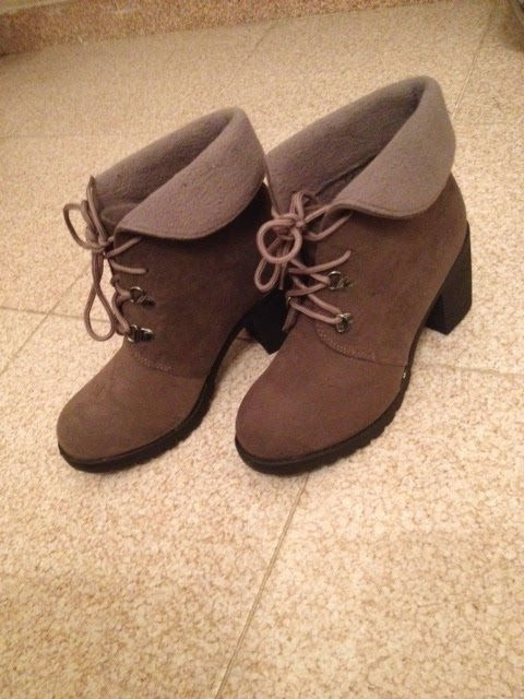 Le scarpe sono in eco-pelle grigio/fango scamosciata con risvolto, modello stivaletto; hanno il di 8cm con effetto plateau davanti e sono calde e comodissime già senza l’ausilio di solette ( che io metto in ogni scarpa per renderla più comoda). Sono leggerissime e non vedo l’ora di testarle dopo un pomeriggio di shopping in centro.