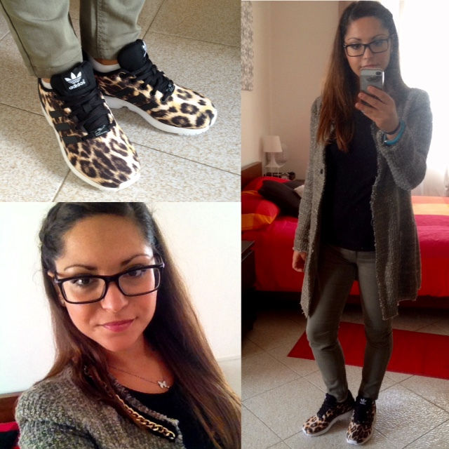 L’outfit di oggi è praticamente bicolore verde militare-nero con accenni dorati, come sempre comodo ma femminile per tutti i giorni: top nero con maniche a 3/4 di Bershka, cappottino bouclè con collana incorporata stile Chanel comprato al Mercatino di Forte dei Marmi, pantaloni elasticizzati della linea push-up di Stradivarius e ai piedi le mie bellissime Adidas ZFlux leopardate ormai introvabili.