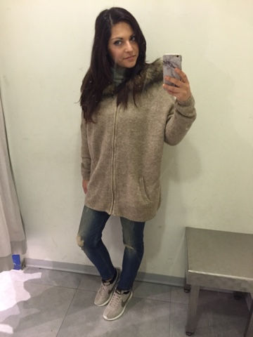 Oggi è spuntato un raggio di sole per cui ho scelto un outfit super comodo e caldissimo: maglione taupe taglio over di Promod, jeans alla caviglia con cerniere e strappi di Stradivarius, sopra un cardigan beige over con zip oro e cappuccio in pelliccia ( sintetica, ovviamente!!).