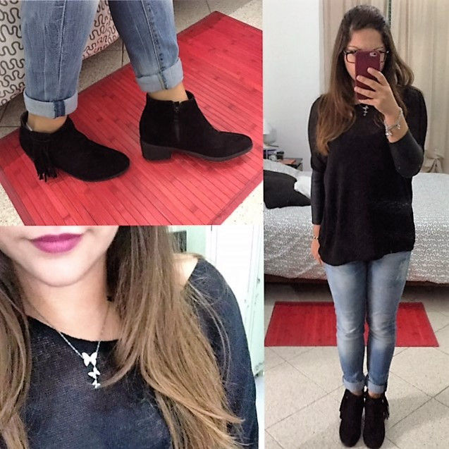 maglia oversize nera con maniche in ecopelle di H&M; jeans lavaggio chiaro slavati e risvoltati di Alcott e ai piedi stivaletti in ecopelle scamosciata con frange alla caviglia di Pimkie.
