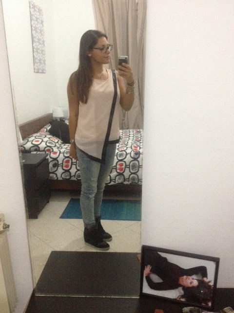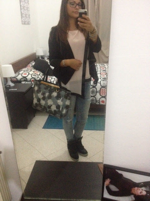 Outfit domenicale un pò senza troppi fronzoli e con qualche gioco di lunghezze: giacchino corto nero in cotone Bershka, top in chiffon rosa cipria con bordatura in raso nero di Zuiki, jeans con strappi tagliati alla caviglia di H&M, Borsa da braccio impermeabile stampata di Carpisa e sneakers alte di Motivi.