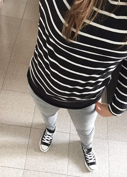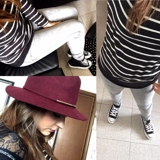 Oggi outfit semplicissimo: maglia a righe bianco e nero con inserto in pizzo sulle spalle di Promod, jeggins grigio chiaro di AW Lab, ai piedi le mie amate Converse All Star b&w e in testa un bellissimo Fedora bordeaux di Pimkie in lana caldissima.